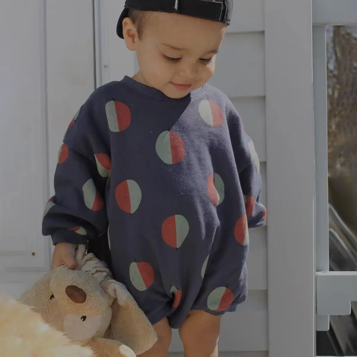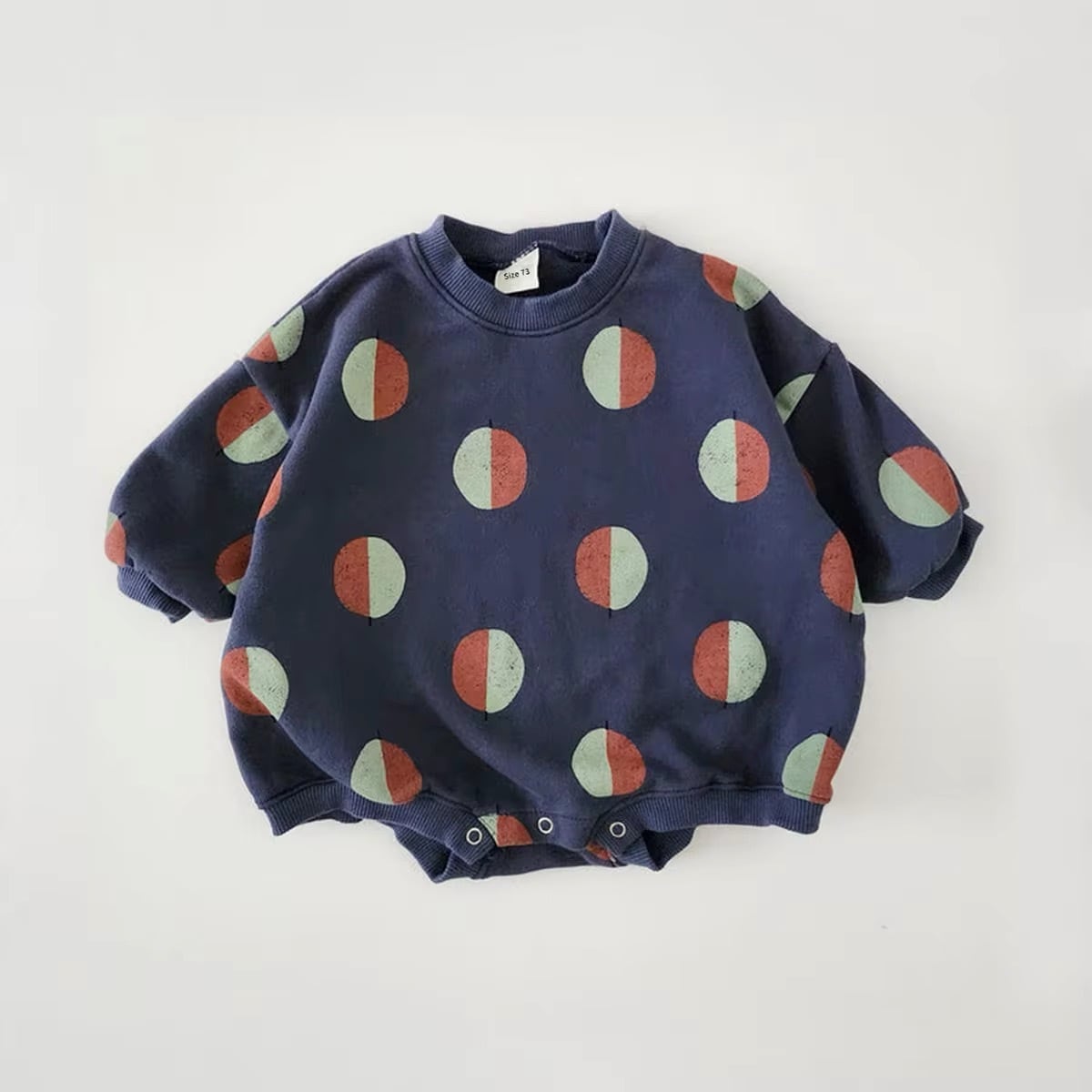 バイカラーのバルーンプリントがおしゃれなスウェットロンパース♪
